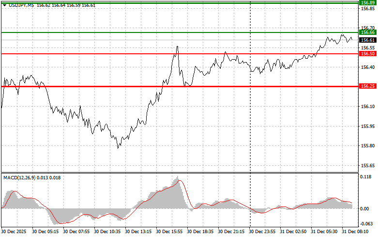 Сценарий №2: покупать USD/JPY сегодня также планирую в случае двух подряд тестов цены 156.50 в момент, когда индикатор MACD будет находиться в области перепроданности. Это ограничит нисходящий потенциал пары и приведет к обратному развороту рынка вверх. Можно ожидать рост к противоположным уровням 156.66 и 156.89.