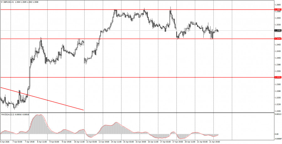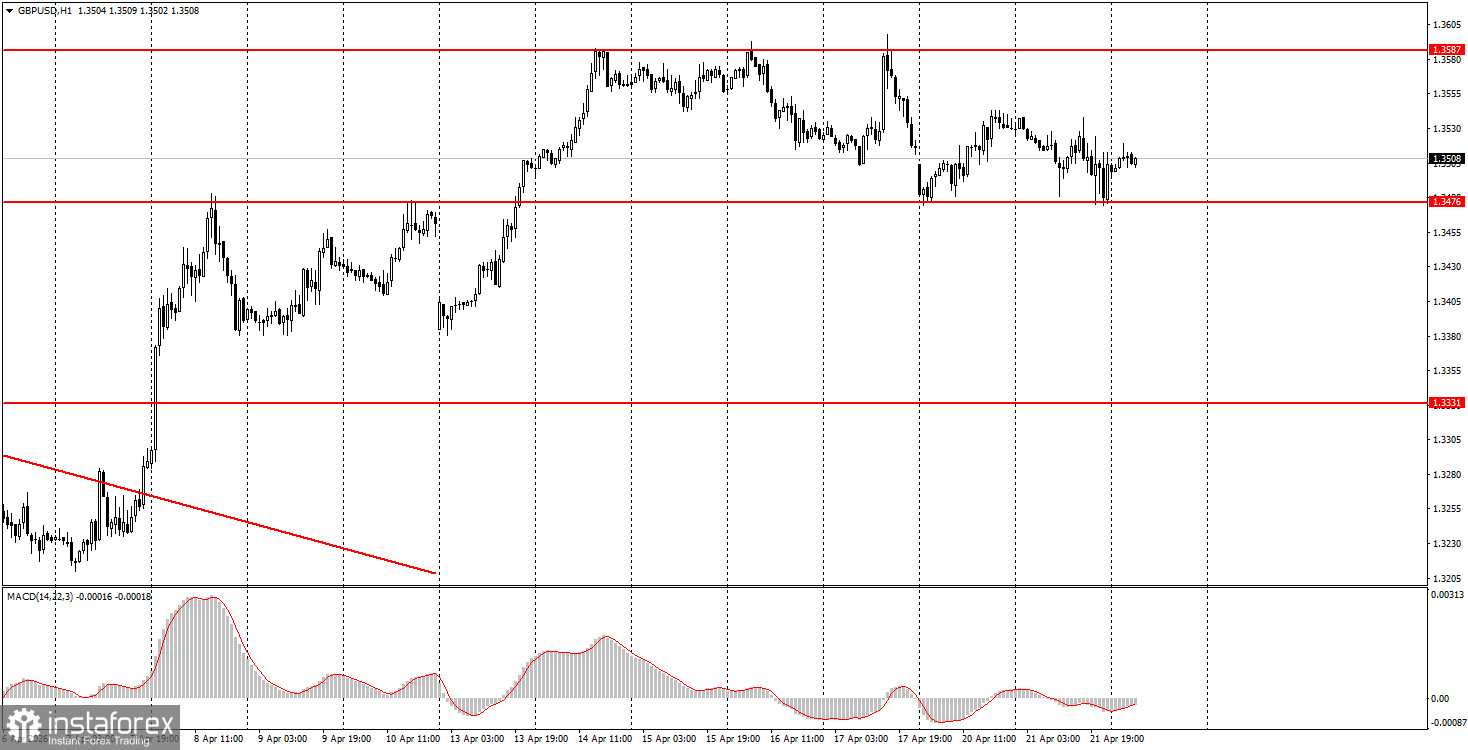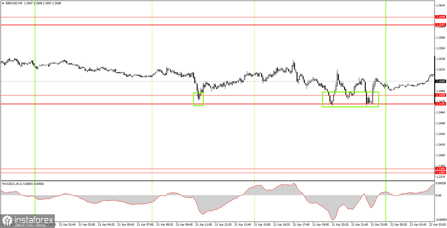 На 5-минутном ТФ во вторник было сформировано два торговых сигнала. На европейской торговой сессии пара отскочила от области 1,3476-1,3489, и на американской произошло аналогичное событие. Таким образом, начинающие трейдеры имели две возможности открыть длинную позицию, но слабая волатильность в течение дня не позволила получить прибыль. Сделку можно поддерживать в среду, 22 апреля.