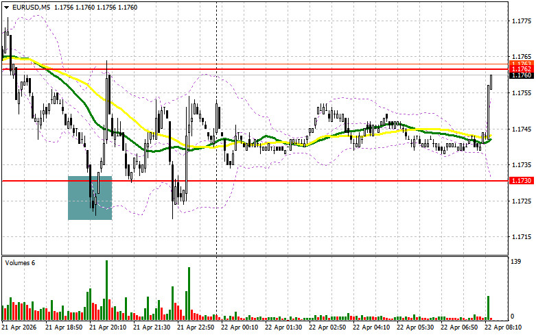 Вчера было образовано несколько точек входа в рынок. Давайте посмотрим на 5-минутный график и разберемся с тем, что там произошло. В своем утреннем прогнозе я обращал внимание на уровень 1.1762 и планировал от него принимать решения по входу в рынок. Снижение и формирование ложного пробоя в районе 1.1762 привели к точке входа в длинные позиции, но после роста пары на 7 пунктов спрос быстро закончился. Во второй половине дня активные действия быков в области 1.1730 позволили еще раз войти в